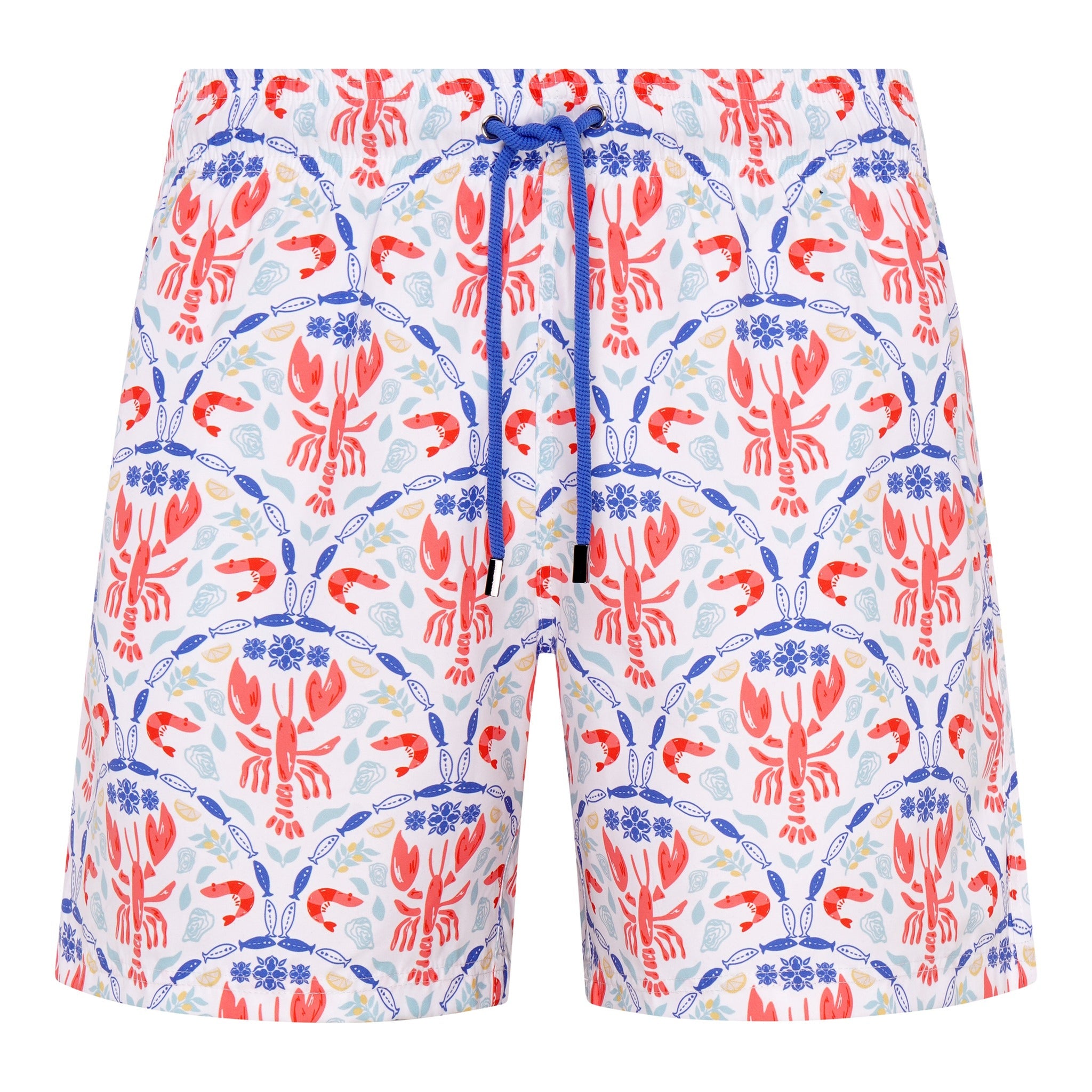 Bask in the coastal charm of the Capri Catch. These swim shorts capture the playful spirit of the Mediterranean with a lively pattern of lobsters set against a mix of orange, blue, and white. The design evokes seaside lunches, salt air, and the easy rhythm of summer days spent by the water—perfect for those who like a splash of character in their style.