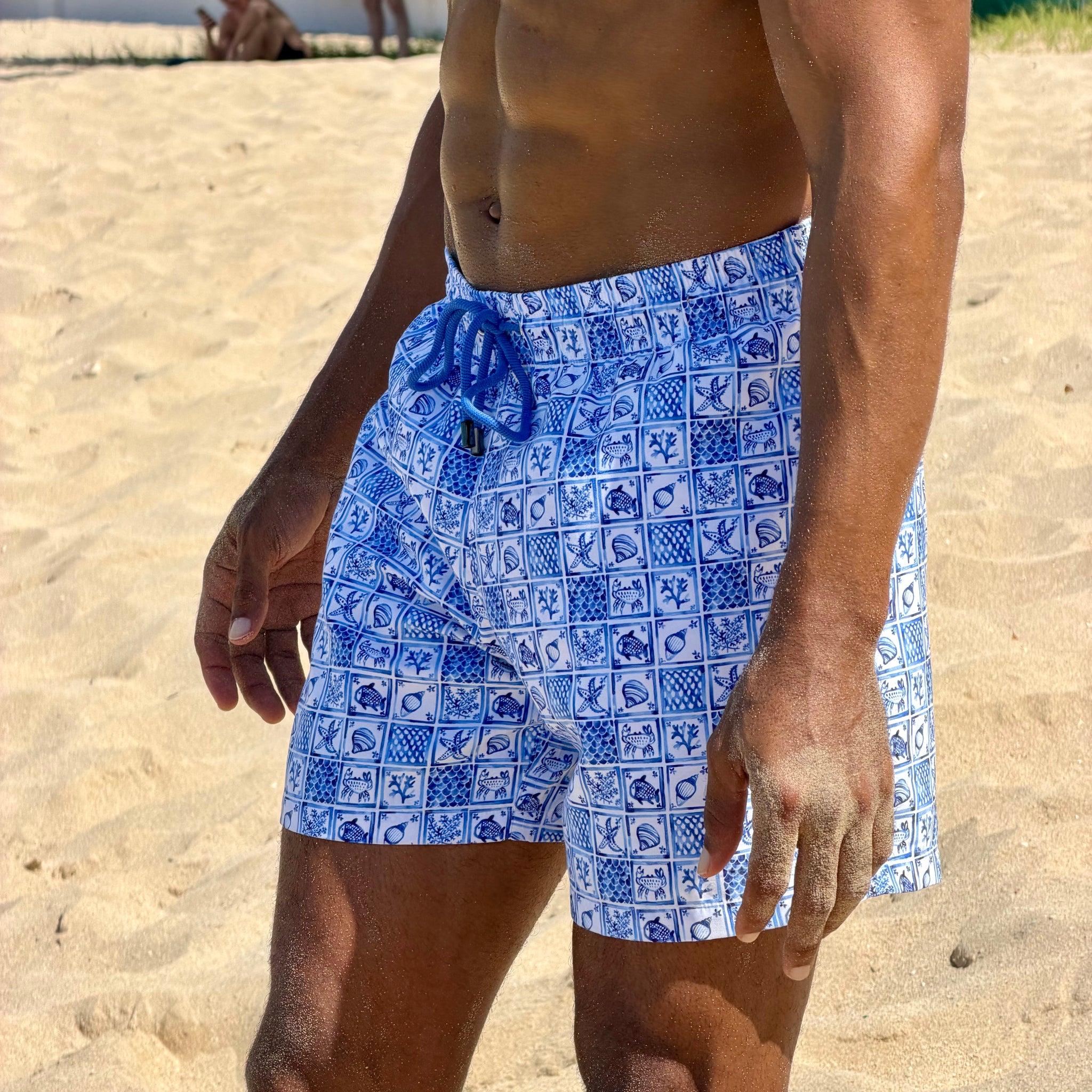 Step into the spirit of the Aegean with the Mykonos Mosaic. These blue swim shorts draw inspiration from the sunlit tiles of Greek island courtyards—each patterned square alive with fish, starfish, and coastal charm. The intricate design evokes the calm of the sea and the energy of seaside wanderings, making them the perfect choice for those who dream in shades of blue.